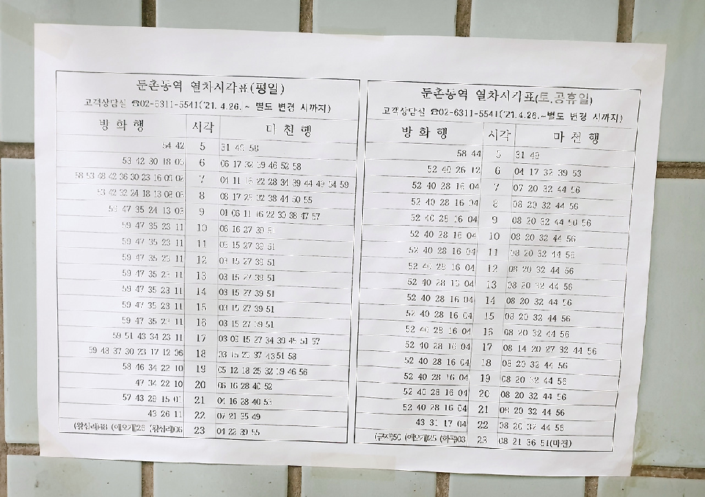 목차 Toggle 서울 강동 둔촌동역 지하철역 시간표둔촌동역입니다. 둔촌동역을 지나면서 지하철역 시간표와 둔촌동역 사진을 올려 본다. 서울 강동 둔촌동역 지하철역 시간표 강동에서 5호선을 따라 둔촌동역을 지난다. 지하철 시간표는 역에서 붙여놓은 것이 가장 정확한 것 같다 오늘의 둔촌역 시간표 둔촌동역입니다. 둔촌동역